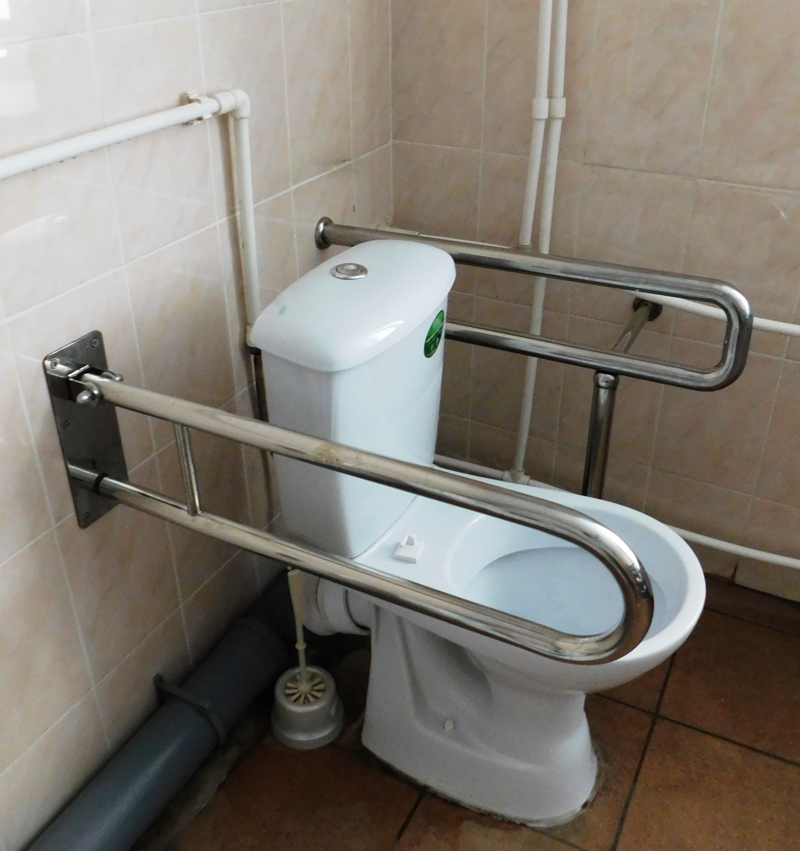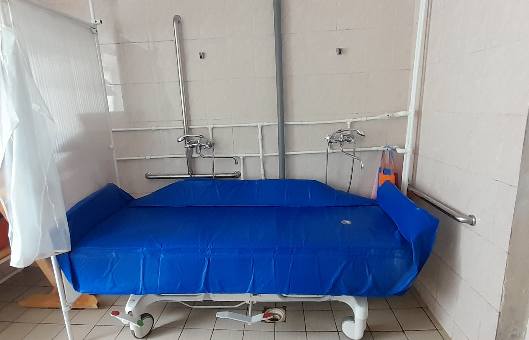 Вход в санузел широкий, без порогов для перемещения инвалида- колясочника, предусмотрены поручни, здесь же расположены раковины для мытья рук. В ванной комнате имеется тележка-каталка для мытья инвалидов.
